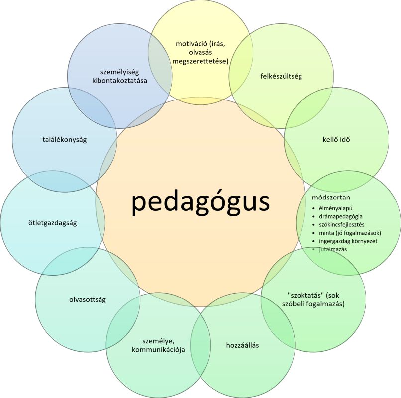 Bár az elsődleges szocializációs színtér a család, és az otthoni környezeten nagyon sok minden múlik, az interjúalanyok véleménye szerint a pedagógus szerepe legalább olyan döntő a fogalmazástanítás sikeressége szempontjából. A tanító az a szereplő, aki a legtöbbet tehet a szociokulturális különbségekből fakadó hátrányok kompenzálásáért. Az ő hozzáállásán (I6), felkészültségén (I10), személyiségén (I6), szakmai rutinján nagyon sok múlik, hiszen a tanulók egyéni személyiségfejlődését végigkövetve, az egyéni haladási tempójukat, a tanulási útjukat, fejlődési ütemüket figyelembe véve (I12) sokat tehet a fogalmazás megszerettetéséért (I19), a sikerélmények megtapasztalásáért (I5). Mindehhez szükséges, hogy megfelelő időt biztosítson (az egyéni fejlődési utak figyelembevételével) a szövegalkotás megalapozására (I20), majd gyakorlására mind szóban, mind írásban (I3, I8). Neki magának példaként kell állnia a gyerekek előtt mind általános műveltség (I11), mind olvasottság (I11) tekintetében, valamint a módszertani sokszínűség is óriási jelentőséggel bír. A pedagógus módszertana (I8, I9), motivációs technikái (I2, I5), találékonysága (I12), ötletgazdagsága (I12) a gyengébb teljesítményű tanulókra is ösztönző hatással lehet, mint ahogy az élményközpontúság (I7, I8), az ingergazdag környezet (I22), az alternatív pedagógiai eljárások (például drámapedagógia, interaktív technikák) (I8, I20), a támogató, bátorító attitűd (I13), a pozitív értékelési rendszer (I22) szintén mind-mind a fogalmazástanítás sikertényezői lehetnek. A 2. ábra a fogalmazás pedagógustól függő sikertényezőit mutatja be az interjúalanyok válaszai alapján.