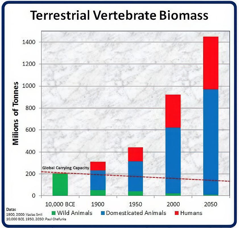2. ábra: Az elmúlt tízezer évben a szárazföldi gerincesek biomasszájának megoszlása alaposan megváltozott. A vadállatok világa helyett ma körülbelül 30% az ember, 67% a háziállatok és 3% a vadállatok aránya. Ráadásul az ember és a háziállat lényegében ugyanaz a játékos, tehát a végeredmény 97:3 a mi javunkra. Ez szép munka volt pár ezer év alatt. A teljes összeg a többszörösére nőtt, miközben a globális eltartóképesség csökkent (forrás: https://www.greenpeace.org/international/story/17788/how-much-of-earths-biomass-is-affected-by-humans/).