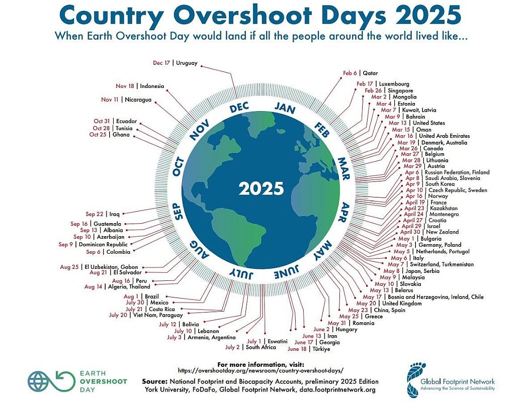 3. ábra: . Ha mindenki úgy élne, mint a katariak, február 6-ára sikerülne felélni az adott évre jutó megújuló forrásainkat, onnantól hitelbe fogyasztanánk. Ha mindenki úgy élne, mint az uruguayiak, akkor viszont december 17-ig lenne elegendő forrásunk. A világátlag nyár közepén van, tehát globálisan évente körülbelül két bolygónyi erőforrást fogyasztunk. Könnyű belátni, hogy a végtelen növekedés illúziójának időszaka a végéhez közelít (forrás: https://overshoot.footprintnetwork.org/newsroom/country-overshoot-days/)